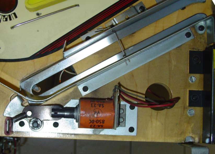 Remove the switch under the right slingshot and the lamp under the right slingshot. We need this place here for the flipper assembly.