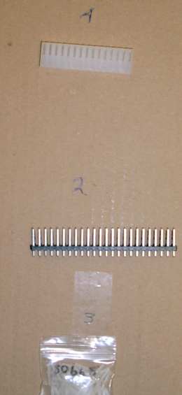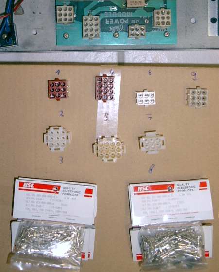 1) J4 and J5 - pc-mount male pin socket 9 pin (8125) 2) J4, J5 and J1 - plug body .085 9 pin (80690) 3) female .085 pin (gen-000-000146) 4) J3 - pc-mount male pin socket 12 pin (8499) 5) J3 - plug body .085 12 pin (80691) 6) J2 and J6 - pc-mount male pin socket 6 pin (5604) 7) J2 and J6 - plug body .085 6 pin (16403) 8) male .085 pin (gen-000-000148) 9) J1 - pc-mount female pin socket 9 pin (????) The plug bodies are empty. Use pin no 3 for male sockets and pin no 8 for female sockets (only J1). |