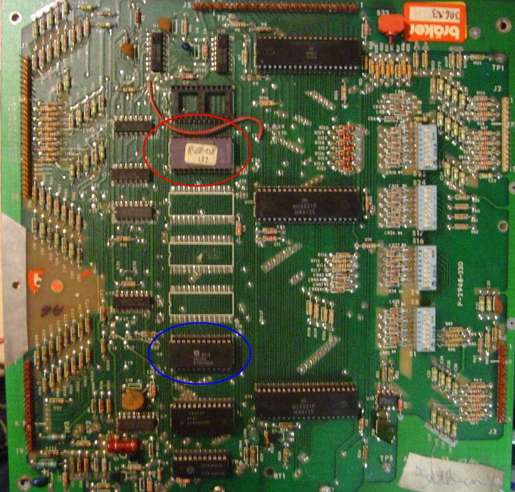 When you look at a bally-35 mpu, you see two or more game specifc eproms (red circle around the u2 chip and blue circle around the U6 chip, sometimes u1 is filled also).